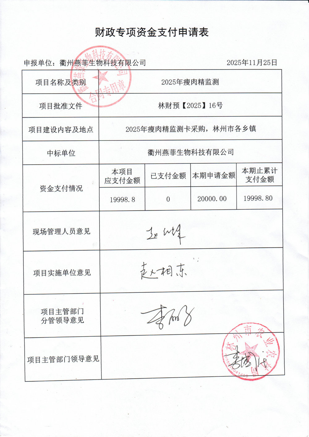 林州市农业农村局2025年瘦肉精监测资金支付公示