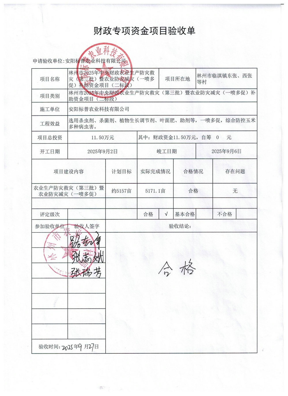 林州市2025年中央财政农业生产防灾救灾(第三批)暨农业防灾减灾(一喷多促)补助资金项目(二标段)支付公示